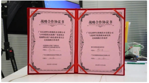座谈会上,亿固集团分别与中建五局工程创新研究院、德州学院粉煤灰研究所、中国散装水泥推广发展协会地聚物水泥与绿色建材委员会签订战略合作协议。