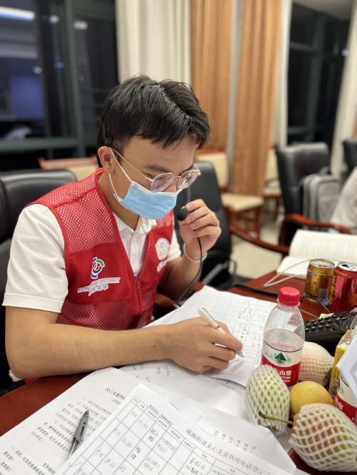 晚上11点到早上7点,他们守在电话前,当上了特殊“客服”,接听社区居民的求助电话,在他们的声音里,有家里物资不够的反映,有身体不舒服的求助信息,还有许多带来不便的状况需要解决。志愿者们耐心安抚他们,并解决他们的问题。