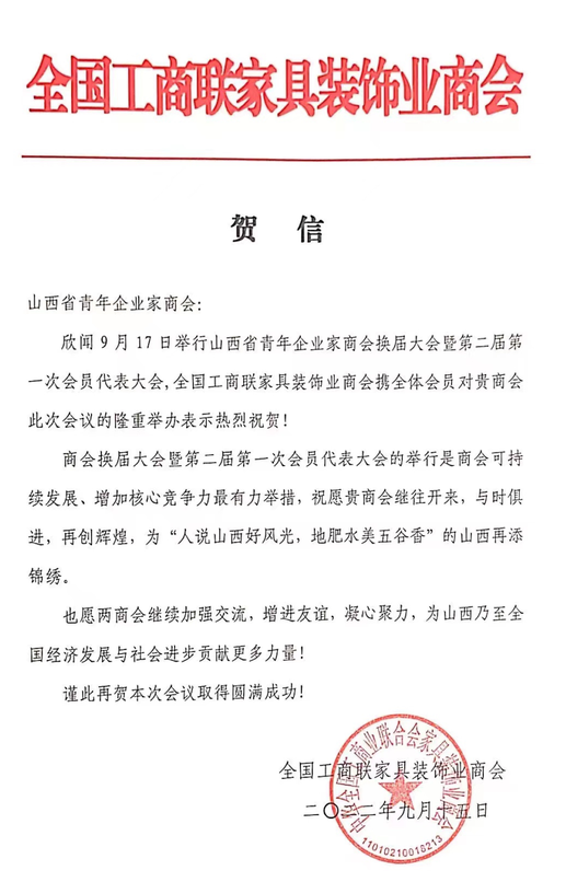 全国工商联家具装饰业商会青年企业家委员会受邀出席本次大会,并与山西省青年企业家商会、全国工商联汽车经销商商会青年委员会、江苏省青年企业家联合会、内蒙古青年企业家商会等四家青年企业家团体举行了友好商会签约。