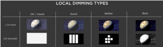 在百级到三百级的区间内,对比度开始有了显著提升,加上液晶面板中的液晶分子可以控制光的通过,背光分区面积的缩小,大幅度减少了光晕的产生,电视综合画质有了明显提升。目前这一区间也是采用分区背光技术的电视产品所选用的主流方案。
