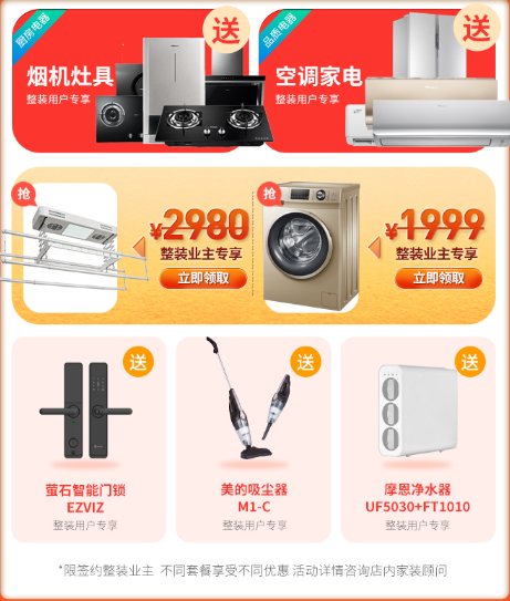 沪尚茗居免费送家电啦!家装108茗居专场活动期间,只要签约整装,10大品牌家电免费领!海尔、老板、美的、摩恩....烟机灶具、空调家电、智能锁、吸尘器...全屋家电一站式配齐,装修预算省3w!