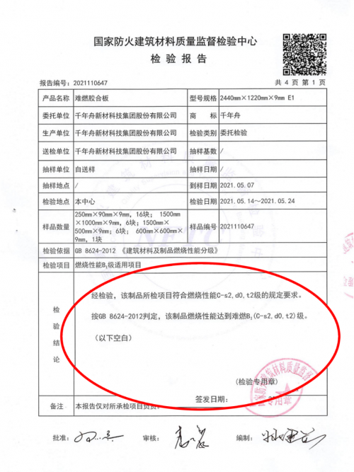 除此之外,千年舟难燃胶合板通过国家防火建筑材料质量监督检验中心检测,符合GB 20286-2006《公众场合阻燃制品及组件燃烧性能要求和标识》认证要求,获得公共场所难燃制品及组件标识使用证书,单体燃烧、可燃性、烟气毒性等级检测均合格。因此,在遇火后起烟慢、产烟少、烟毒性更低,可以避免因火势冒出的浓烟而引起的危害,更安全。