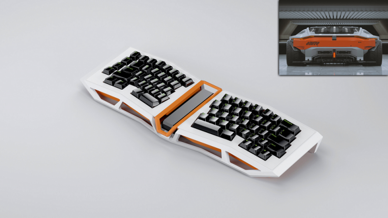 灵感来源于位于好莱坞的概念设计师 Shane Baxley 的其中一款概念超跑设计。Baxley 是设计跑车的高手,同时也是调色大师。我们使用特殊的烤漆工艺,把复古的白色和热烈的鲜橙色相结合,在桌面上实现概念跑车的构想。