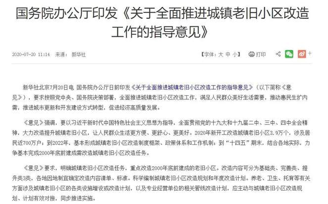 日前,国务院办公厅印发《关于全面推进城镇老旧小区改造工作的指导意见》,《意见》指出,到“十四五”期末,力争基本完成2000年底前建成的需改造城镇老旧小区改造任务。