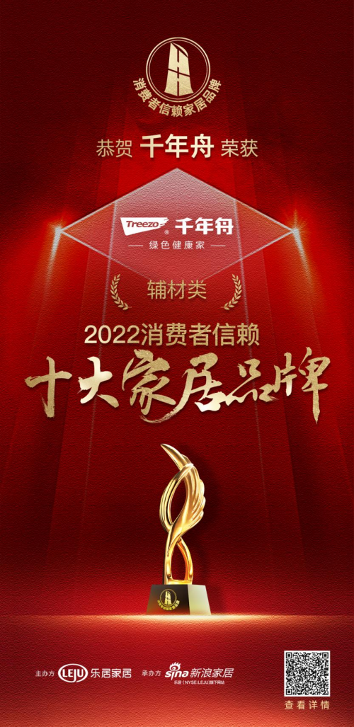 2022年11月1日,历时52天,历经网络票选、专业评审的「2022消费者信赖十大家居品牌」辅材榜单正式揭晓。其中,千年舟荣登「2022消费者信赖十大家居品牌」辅材榜单!
