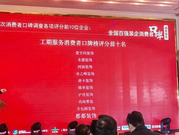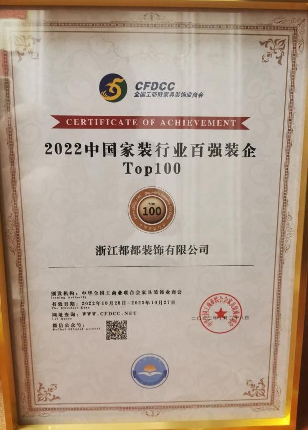 今年10月末,在由全国工商联家具装饰业商会主办的“2022中国家装百强榜”上,都都装饰从设计服务、施工服务、材料服务、工期服务、工地现场管理、环保服务、零增项服务等七个方面的脱颖而出,以绝对优势登上“2022中国家装行业百强榜”及“工期服务消费者口碑十强榜”两个榜单,这不仅体现出都都装饰强大的综合实力、口碑和家装影响力,也代表了业内对都都装饰实力的认可,和客户对都都的信任与支持。