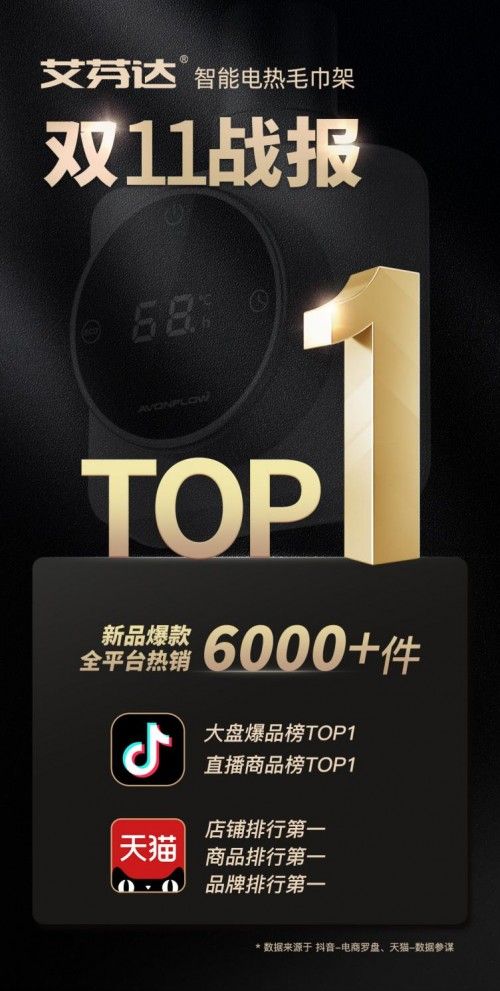 一年一度的双11狂欢购物节已经落下帷幕,各大行业榜单排名备受关注。在智能电热毛巾架类目中,艾芬达斩获天猫抖音双平台第一。
