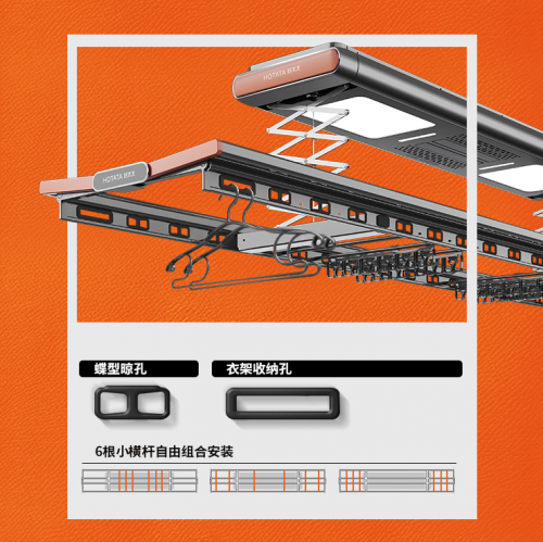 例如极具美学视觉效果的创新晾孔,1个蝶型晾孔其实相当于2个常规晾孔。其实千万不要小看这个细节的革新,不但让晾晒衣物翻倍,还起到美观颜值的作用。并且4个衣架收纳孔、6根自由横杆、4排母婴夹,这些元素的增加,使得晾衣机更加实用,是对产品的更进一步的深究和钻研。