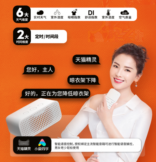 而智能操控技术的运用,更是让晾衣机得到了前所未有的关注。连接APP随心掌控、智能语音控制,产品人性化到不可置信:知日夜、懂天气、懂人语、懂人心、能沟通、会交流,天猫精灵随时听候主人调令,让黑科技产品提前便捷生活,提升生活质量,拉高生活调性,无限增大幸福指数。