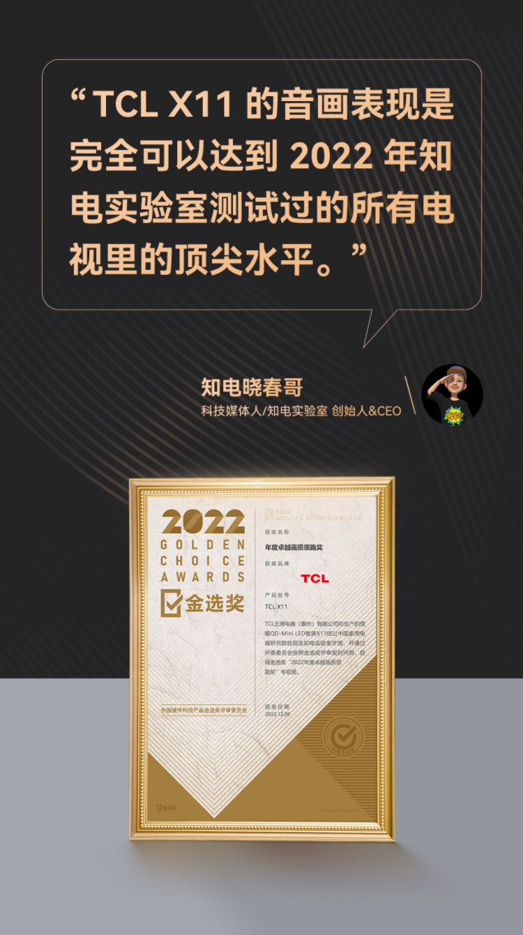 TCL作为国内家电的领军品牌,本次大会也是收获颇丰,像是TCL X11就凭借优秀的画质表现,荣获金选奖「年度卓越画质领跑奖」殊荣,其实TCL X11自推出以来,就被很多业内媒体称为“画质天花板”,所以此次能获得这个奖项,也算是实至名归。
