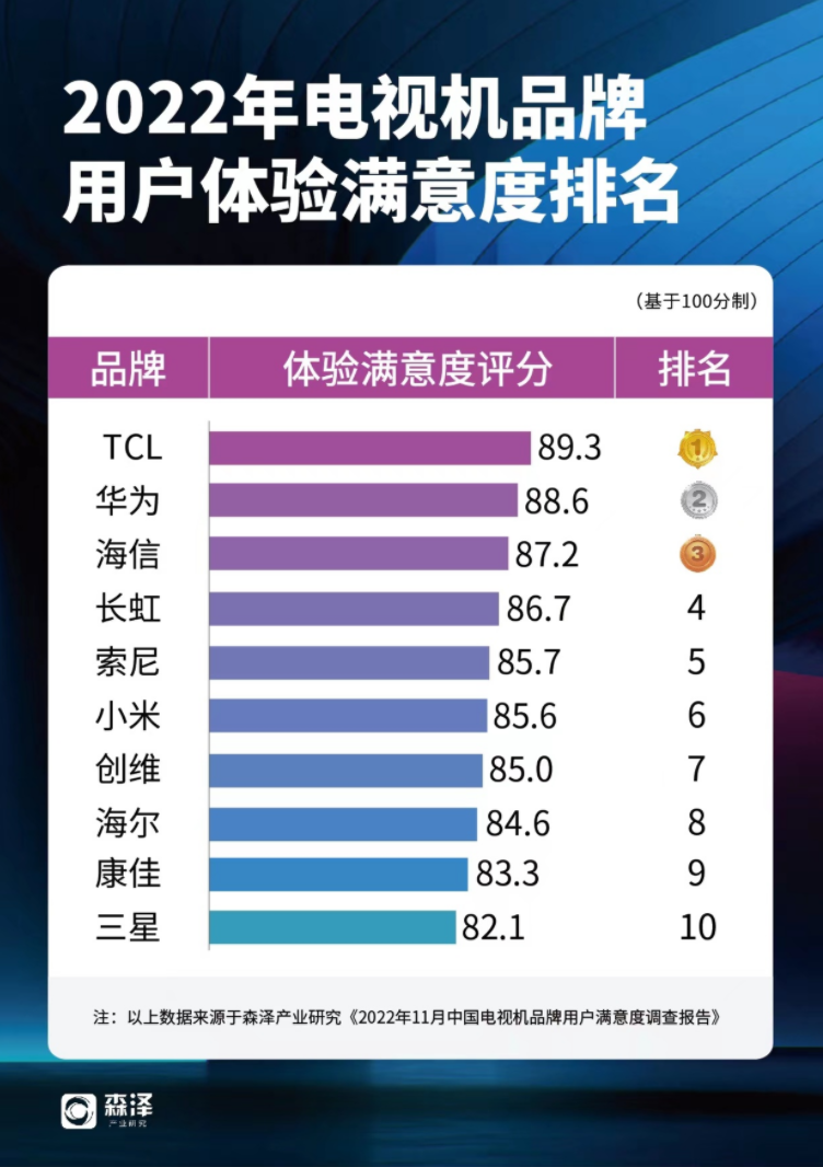 此外,从最近权威调研机构森泽产业研究公布的「2022中国电视品牌用户满意度调查」报告来看,TCL品牌的用户净推荐值最高,为50.7%,即品牌用户忠诚度最高;同时用户对TCL品牌的整体满意度评价最高,为89.3分,且TCL品牌在各项体验方面均表现突出。换句话说,凭借优秀的产品终端打磨,TCL电视能够满足绝大部分消费者的需求,获得了更多消费者认可,在用户留存的同时能够获得吸纳更多新用户。