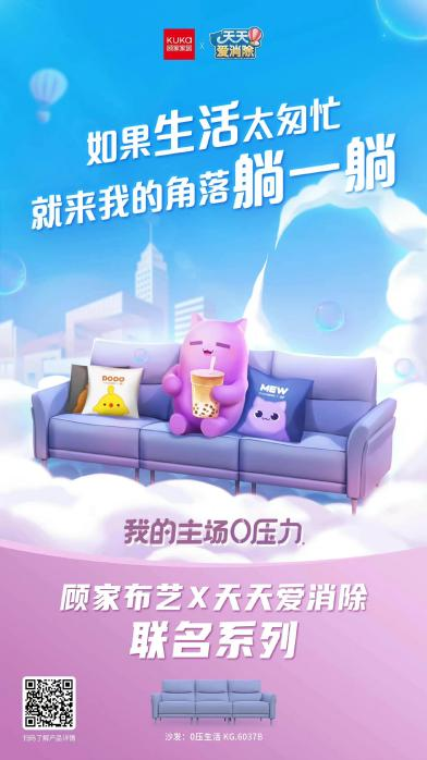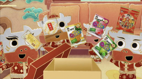 动画视频短片中,在欢快的锣鼓声中,顾家家居的吉祥物顾家牛与旺旺的卡通形象旺仔一起送出联名好礼。本次联名中,顾家家居和旺旺推出了三款联名跨界设计产品,分别是以旺旺经典产品仙贝、雪饼QQ糖为灵感,专门针对年轻人的家居需求设计的掀贝沙发椅、学饼桌和懒人神器QQ躺。