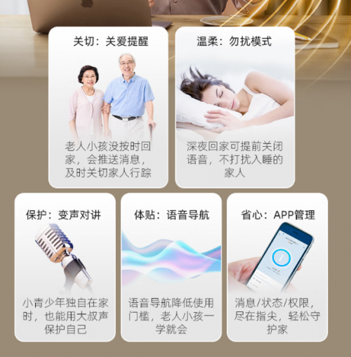 好太太品牌一直再向体验式智能家居引领者所努力,从这款V86S的特色功能就能窥见一二。该款产品提供关爱提醒(老人小孩未按时回家)、勿扰模式(深夜回家关闭语音)、变声保护、语音导航、APP管理共五种家庭关怀设计。尤其是变声保护功能,小朋友或者单身女性单独在家时,可以用大叔声音来保护自己。