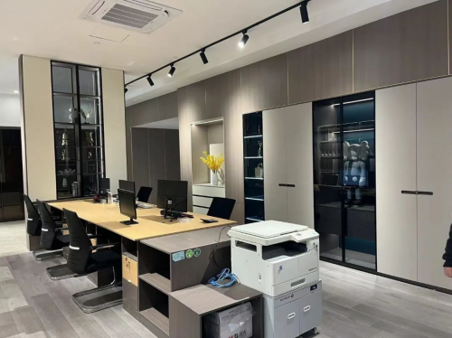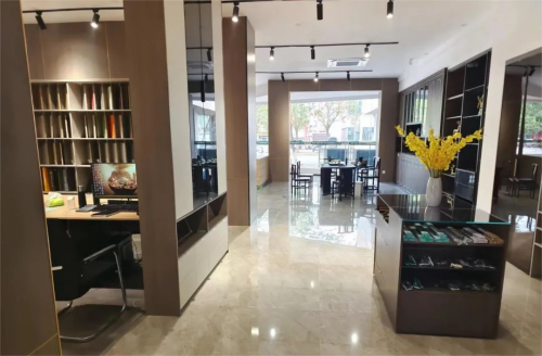 走进门厅,映入眼帘的首先是黑白色简约风前台。门店的前台是千年舟公司品牌文化的体现,极简风前台无不彰显着千年舟的格调与沉稳。