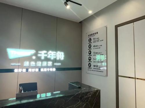 绿色的品牌logo体现着千年舟打造绿色、环保、高品质板材及其配套产品的理念。细看墙上还贴着舟到服务五大标准,为顾客提供良好服务也是千年舟的宗旨之一。