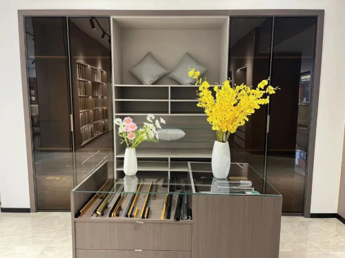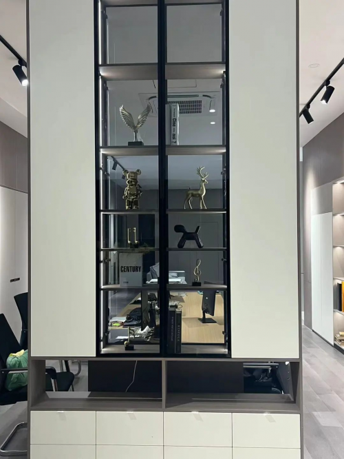 隔断柜整体半透明设计满足了隔断、储物、展示及装饰需求,虚实结合,有曲径通幽的意境之美。