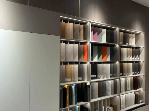 一整面浅色系的选样柜上陈列的是各种花色的板材,可给顾客提供更多的花色选择。