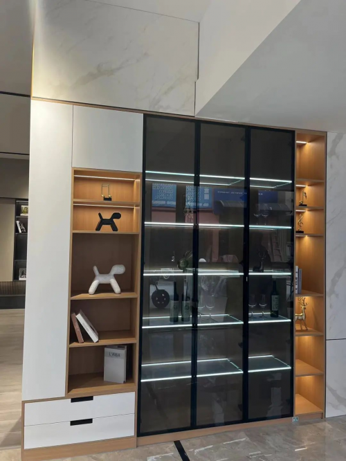书柜采用了透明玻璃和木制板柜的结合,隐约可见里面的装饰物,可以体现出主人的文化气质。左右两边的木柜有灯光点缀,又格外引人注目。