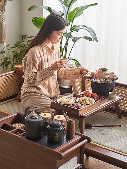 因此,原始原素顺势推出黑胡桃木系列围炉煮茶套餐,涵盖罗汉床、炕几、边几、边桌、茶几、果盘、收纳盒、藤编椅和书架9个品类产品,助力消费者打造居家版围炉煮茶,共享松弛感冬日居家氛围。