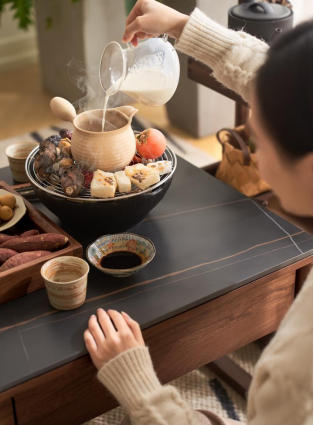 3、煮茶家具:原始原素茶几选择岩板的,耐高温不怕烫以外,还特别好清洁,原始原素推车选择可移动的,轻松移动,随意放置,蒲团,单椅的选择怎么舒服怎么来!小食餐盘选择可分格的,储物空间大的。