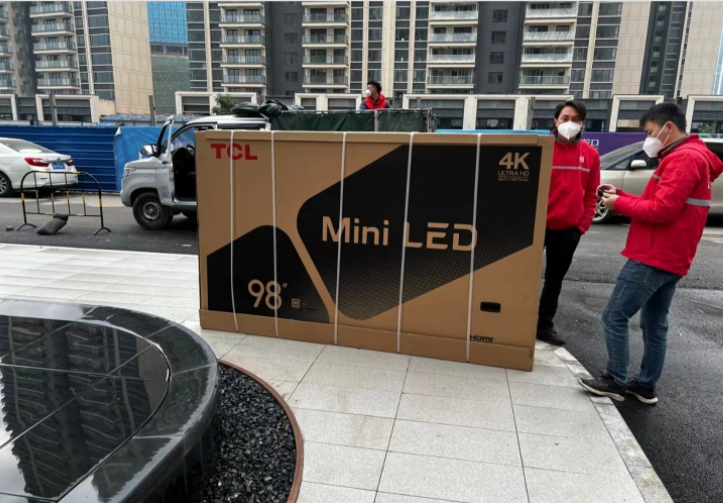 出于好奇心,我问了问售后人员,这电视看着不小啊,怎么进电梯、进门这么轻松。TCL售后人员说,为了让98英寸巨幕电视更容易入户,TCL采用了金属边框设计大幅减少电视尺寸冗余,安装师傅只要拆掉包装并做好保护,进入96%以上的住宅电梯毫无压力。