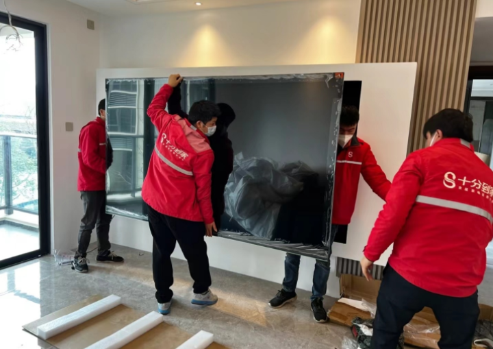 实际安装过程也确实如此,从门岗到我家单元门口300米的路程,师傅们用小推车小心翼翼的走了有10分钟时间,一路上他们精心呵护,避免磕碰剐蹭,非常用心。随后,电视也顺利进入电梯,来到我家客厅。
