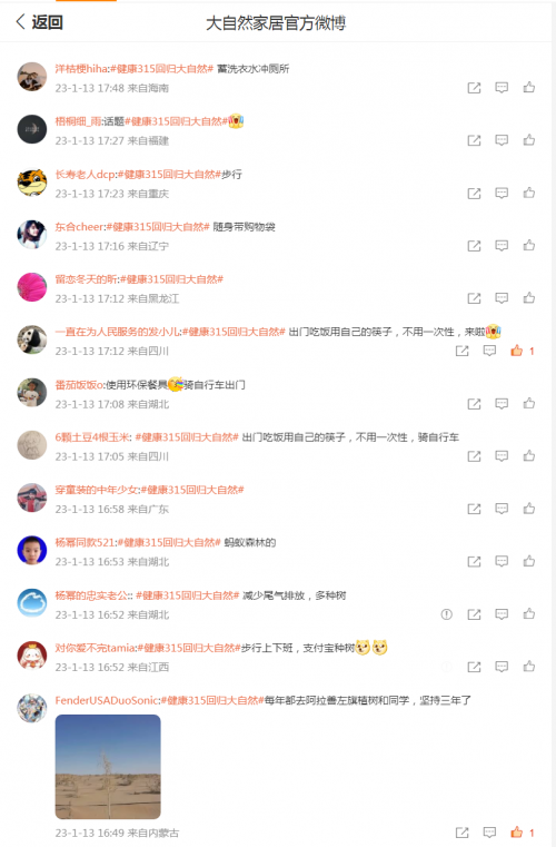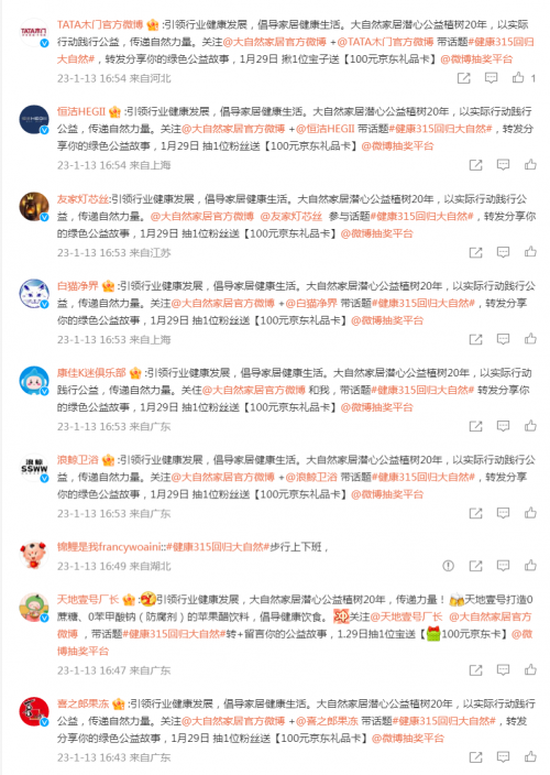 家居行业一向是环保事业的支持者,本次活动就引发了各大家居建材知名品牌强烈共鸣。作为多年的绿色公益先锋,大自然地板此次可谓是一呼百应,以微博为主阵地,建材、五金、照明、卫浴、家纺、家电等众多倡导绿色低碳、致力行业健康发展的家居伙伴ARROW箭牌家居、LESSO联塑官微、土巴兔装修APP、TATA木门官方微博、慕思寝具、诗尼曼整家定制等品牌蓝v纷纷转发活动微博,号召全网网民聚力公益事业。