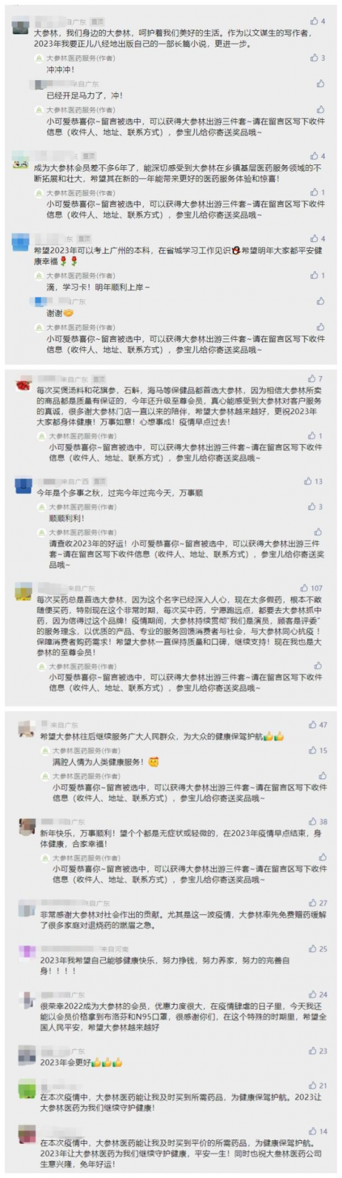2023年,大参林以饱满精神迎接新征程,将加倍努力打造更专业的用药服务,热心为广大市民的健康保驾护航,积极承载上市药企的社会责任与担当,继续“满腔热情为人类健康服务”。