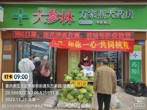 食品也是居民日常必须品,在疫情期间的配送也同样受到困难。在了解到顾客的切身需求后,大参林重庆营运区还额外增加了果蔬配送服务,提供购药购菜一条龙服务。