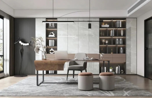 「嘉陵南岸雨初收,江似秋岚不煞流。」整体色调如秋天原野般温暖,自然暖黄结合天然木纹,纹理细腻不突兀。细看底纹婉约,山纹柔顺,娴雅柔美的曲线如同田野精灵的舞蹈轨迹,以质朴色彩为空间带来柔和的安全感,用来自大自然的原木色慰藉风尘仆仆的心。