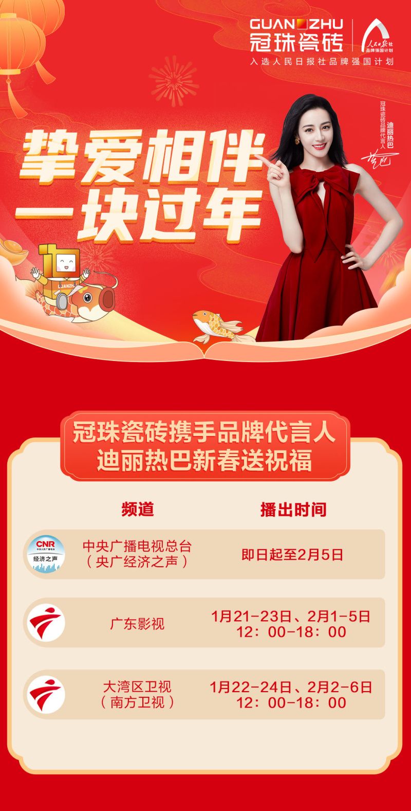 冠珠瓷砖不仅在“幸福列车与南方航空”上暖心相伴,还携手品牌代言人迪丽热巴,在春节期间以美好的祝福登陆中央广播电台与广东/南方卫视,愿大家新年快乐、事事顺利!