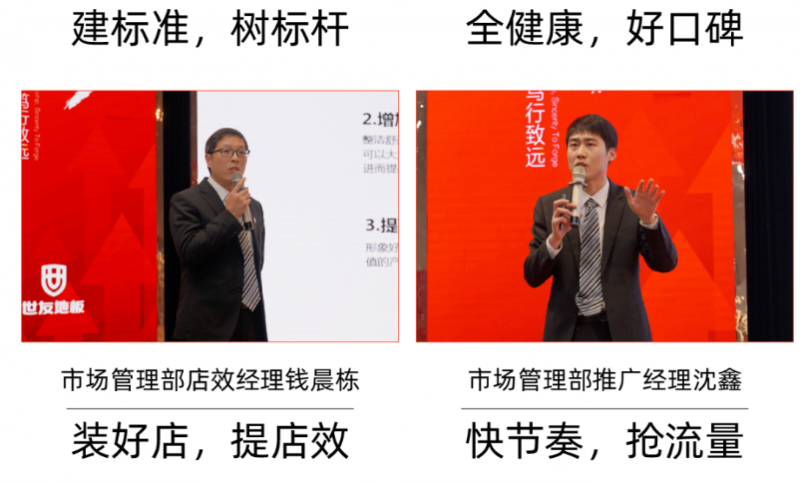 世友地板总裁倪月忠先生在会上提到,3年疫情的考验,充分展现了世友营销团队吃苦耐劳,艰苦奋斗的优秀品质,在疫情后时期,面对经济全面复苏的新机遇和新挑战,营销的首要工作是明确目标和任务,统一思想,理清思路,脚踏实地,执行不怠;要聚焦“全健康”,满足不断升级的消费需求,深挖产品和服务价值,多元化渠道创新拓展;要全面落实“招好商、装好店、好产品、全渠道”工作的执行。