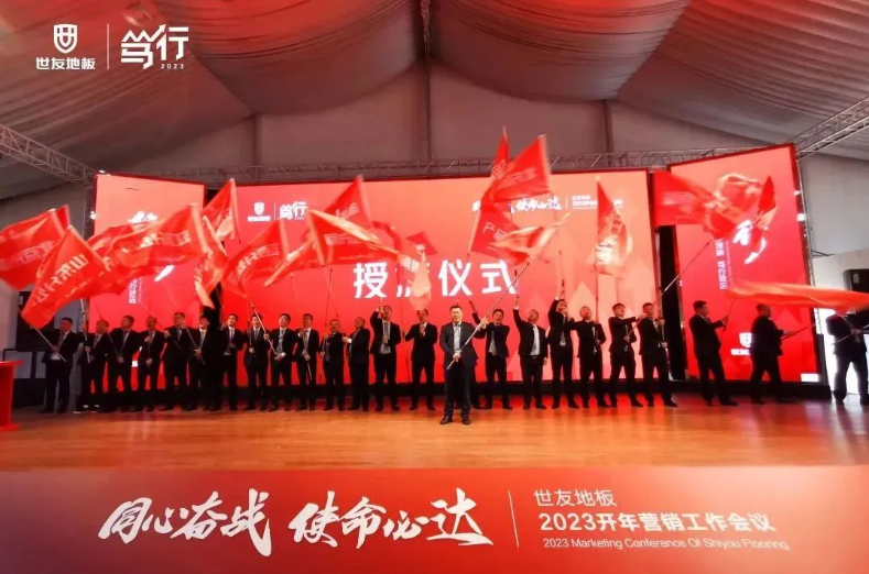 在会议尾声阶段,副总裁屈凡军与运营部总经理、职能部门负责人、分公司经理,纷纷扛起象征使命的大旗,同心奋战,使命必达。2023年,世友地板零售中心全体将士将全力以赴,以乘风破浪之势,勇创未来佳绩!
