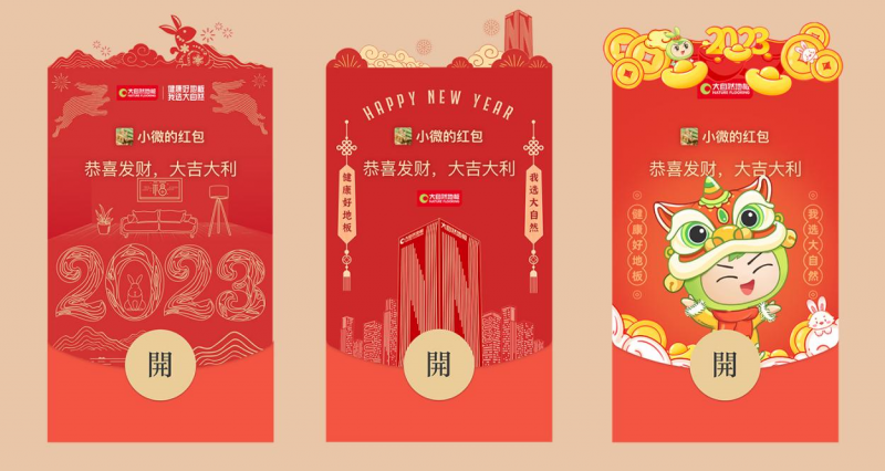 围绕春节高频场景“春节红包”,大自然地板还将兔年元素、春节祝福与“然然”IP联结起来,推出了多款不同封面高级感十足的创意红包,传递品牌独特品味、审美,也通过高度贴合用户使用场景的方式,让消费者悄无声息中自发传播,打开品牌传播的突破口。