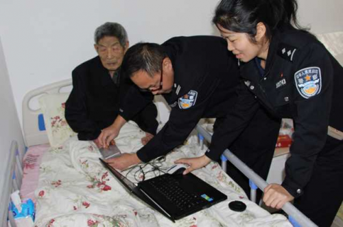 原来,家住旺苍县白水镇的蒋大爷,因在家摔伤头部,到广元市第二人民医院接受治疗。大爷的身份证在转院过程中丢失,报销治疗费用必须要用身份证,而办身份证又需采集指纹,蒋大爷的儿子情急之下向公安窗口民警求助。了解情况后,民警赶到医院,专门为老人采集指纹和相片。由于上年纪的人指纹不清晰,民警一遍遍用湿巾轻轻擦拭老人手指,也一遍遍地安慰着老人。