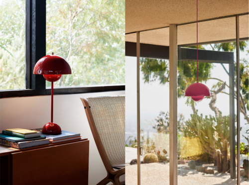 Tangy Pink是一个引人注目的颜色,给房间带来一抹亮色,同时营造了一种充满活力和乐观的氛围。Vermillion Red则十分大胆,灵感来源于经典的红色口红。这两款颜色虽然是Flowerpot的新配色,但早在1986年Panton 60岁生日时的派对邀请函中便可以寻到踪迹了。