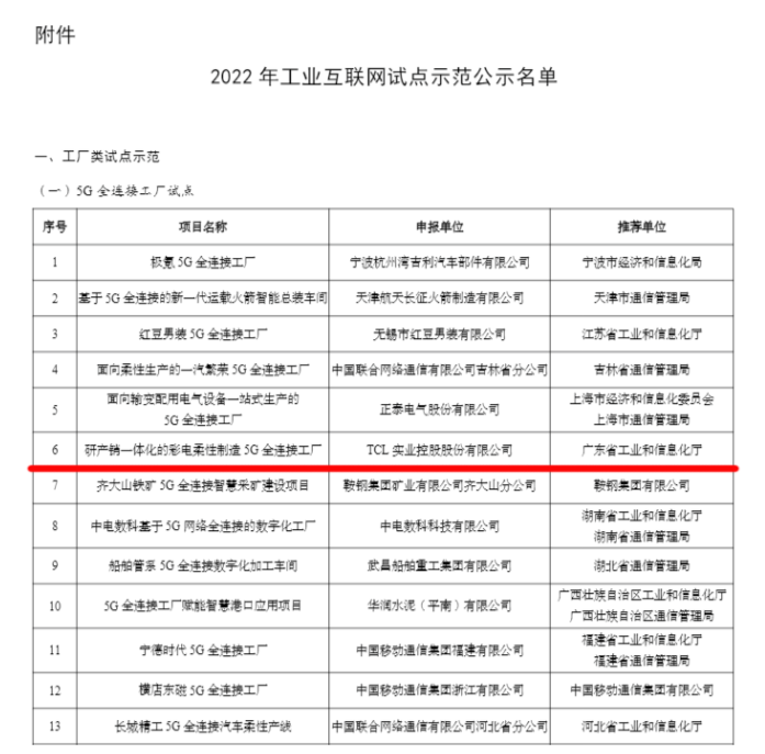 据了解,此次TCL实业成功入选国家“5G全连接工厂”的是“研产销一体化的彩电柔性制造5G全连接工厂”项目建设,全国全行业仅33家获此殊荣。该5G全连接工厂由TCL实业打造,并联合中国移动惠州分公司、灵动科技(北京)、格创东智、华为技术等生态伙伴长期深度参与。