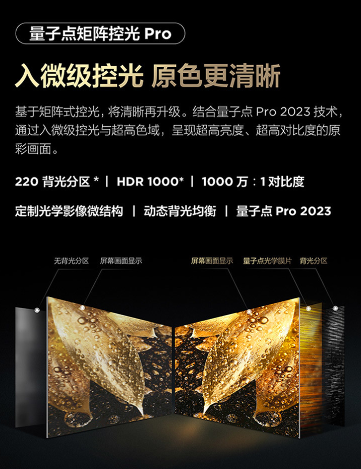 画质:TCL C11G作为一款高画质QLED智屏,搭载了最新一代的量子点矩阵控光Pro技术,实现了灯珠微结构的进一步硬件升级,通过发光芯片(双晶六区高光芯片)和透镜(光学折射式透镜)的优化,实现了更多的背光分区,更高的明暗动态,更强的明暗对比。
