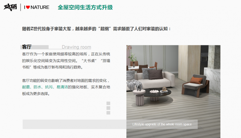 随后,《2019粤港澳大湾区住宅精装交付标准白皮书》主编、想象数科合伙人李可欣女士现场发布《2023绿色家居消费趋势白皮书》。白皮书中指出:随着消费者全空间的生活方式升级,全屋通铺木地板成为潮流趋势,重塑新时代家居空间。
