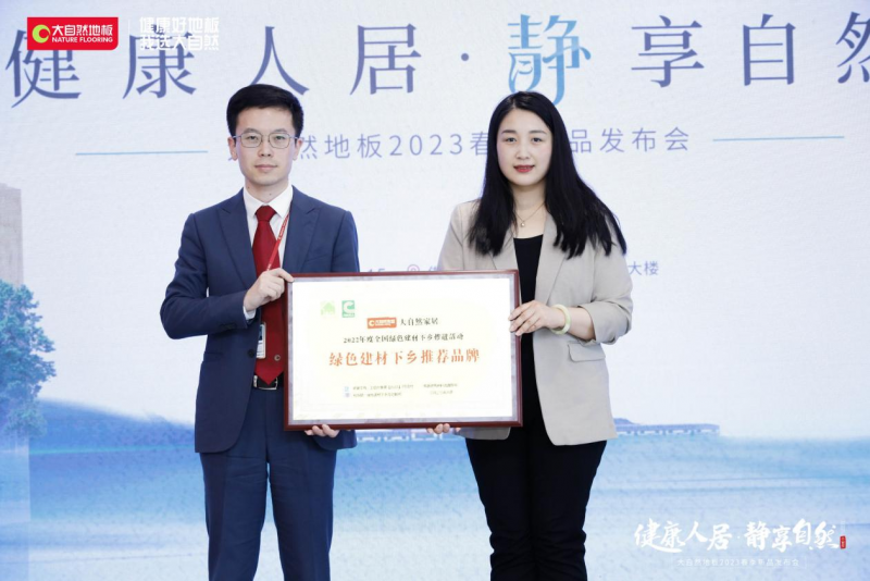 一直以来,大自然地板积极助力绿色健康产品走进更多的家庭,为中国健康人居建设不断添砖加瓦。发布会现场,中国建筑材料流通协副会长冯斯静表示:大自然家居旗下的强化地板和实木复合地板,成功入选由工信部公布的全国绿色建材产品清单和企业名录,其产品质量、安全性、环保性、节能性、低碳化等指标都优于常规产品,因此大自然家居也被中国建筑材料流通协会评审成为“绿色建材下乡推荐品牌”,现场特授予此荣誉奖牌。