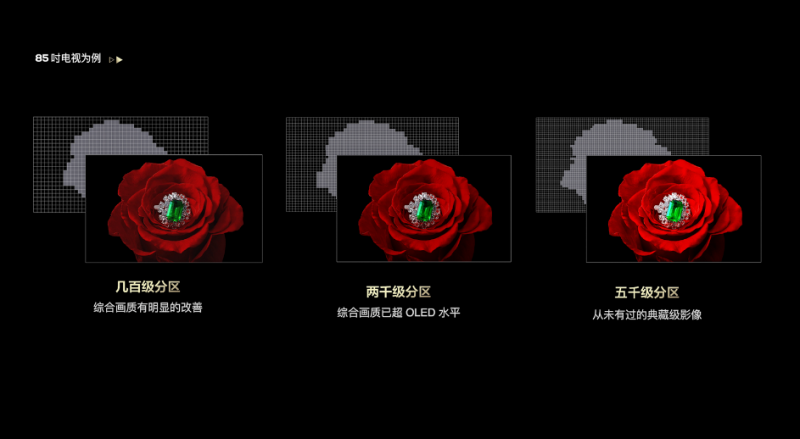 如果对液晶电视成像原理比较清楚的朋友一定知道,传统的液晶电视因为无法分区控制背光的亮暗,使得其在显示黑场效果时没有办法真正暗下去,很容易出现光晕问题,这就催生了Mini LED显示技术,该技术将背光模组进行分区,能够更有效地降低画面光晕,让整个电视画面表现得更为通透自然。