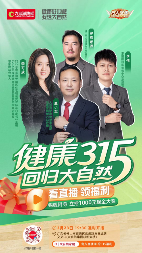 为了给消费者更好的答疑和装修建议,3月23日大自然地板联合东鹏瓷砖空降大自然家居官方抖音直播间,并且当晚直播间中将会有神秘嘉宾和重磅惊喜出现!