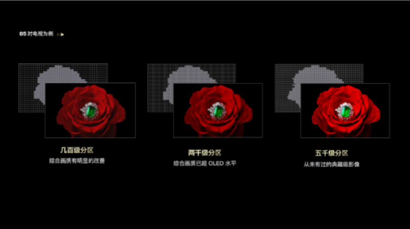 当前,行业内绝大多数轻旗舰级产品尚处于数百级背光分区、千级峰值亮度等,超高端旗舰电视的背光分区与峰值亮度数值也普遍集中于2000~2500,难以满足消费者的更高观影需求,类似于阳光下波光粼粼的湖面、雪山表面的反光等高亮度或者暗光影视作品无法完美呈现,成为行业亟待解决的问题。