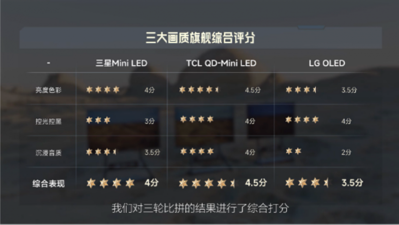 在极果网的测试中,主要是将QD-Mini LED电视TCL X11G和两台韩国的旗舰产品:三星Mini LED电视、LG OLED电视在画质和音质表现方面进行了对比。像是在对比高亮的画面场景时,得益于5000nits的超高峰值亮度,以及5000万:1的超高对比度表现,TCL X11G 在光影细节表现上相比三星和LG而言能够更加还原自然风光的样貌与颜色,做到如肉眼所见一般的真实,这方面也确实是OLED先天的劣势,因为OLED屏幕像素点自发光的原理,如果单像素的表现过亮,就很容易加快烧屏的风险,所以现阶段的OLED电视目前都没有很高的亮度表现。