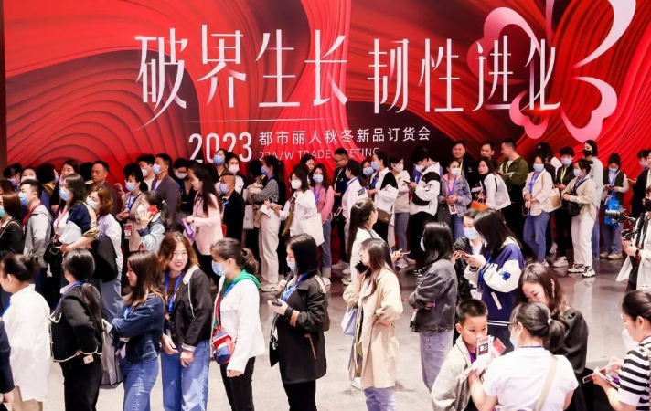 来自全国各地、天南海北将近2000名加盟商,正簇拥在都市丽人2023秋冬订货会的现场。前一天,她们刚刚在位于深圳坪山区的会展中心观赏了一场年度大秀,见到了超级偶像、都市丽人代言人周笔畅。此刻,她们手捧专门用来选货的PAD,埋头仔细翻看新品,一边还用笔和纸勾勾选选。