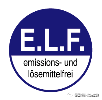 为德语Emissionsminimiert(排放最小化),Lösemittelfrei(无溶剂),Weichmacherfrei(不含增塑剂)的缩写,是德国水性涂料高环保要求的标志。E.L.F.的标准要求VOC最大限量为1g/L,不低于蓝天使的要求。(E. L.F.的标准要求VOC最大限量为1g/L < 中国国标VOC最大限量为100g/L)。