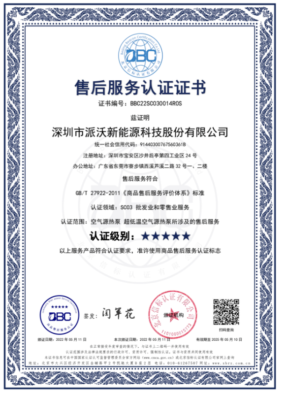 2022年5月,派沃空气能售后服务水平达到相应的国家标准,荣获“五星级售后服务认证”