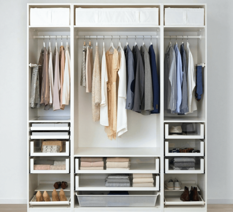 衣柜的选择其实水也是比较深的,可能会涉及到板材、五金、尺寸、配色、开门方式等多个维度,个人建议是不要买成品定好格子的衣柜,这样的话我们在实际放衣服的时候就会被成品的格子束缚住,如果只是定制框架,在内部用架子的形式进行自由定制,往往在后期使用的过程中会更加方便一些。