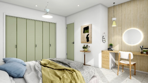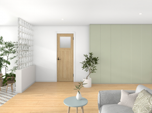 以北欧的自然为印象的绿色,搭配明亮的橡木色,门与墙成为重点,简单却能感受到温暖的空间。