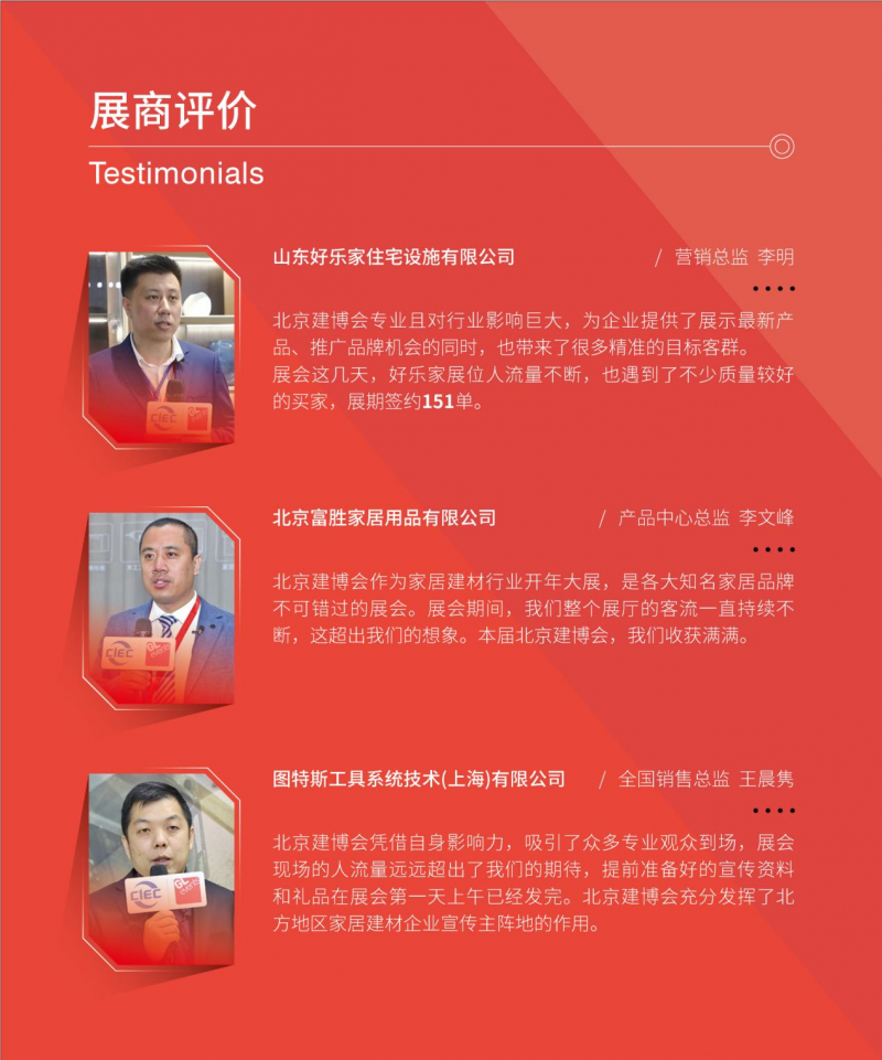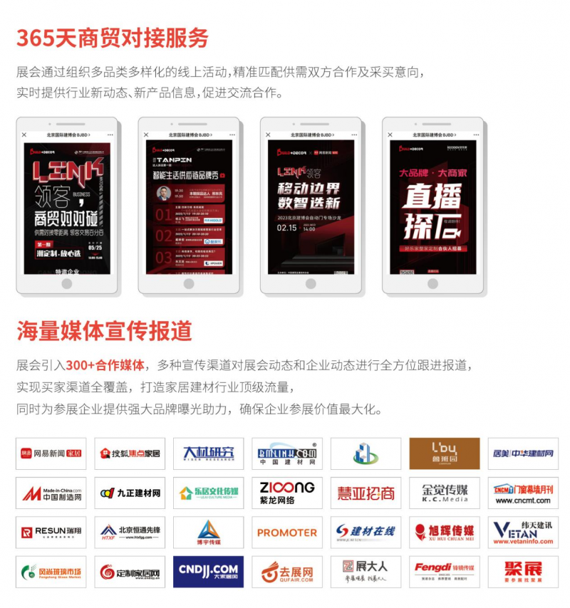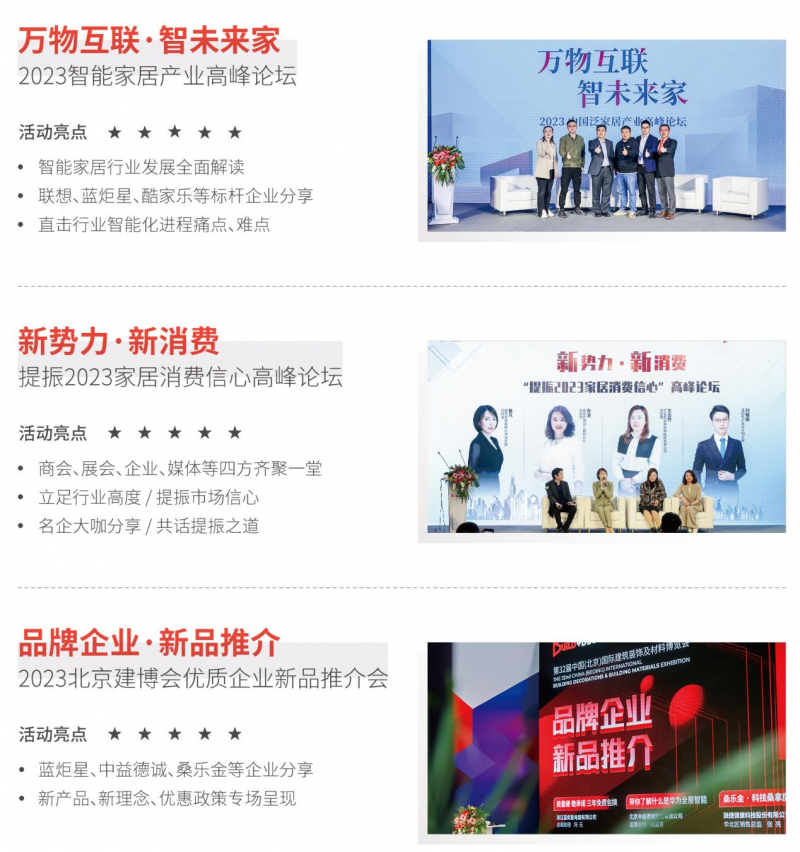 极具向上生长动力的成长型企业一直是北京建博会的中坚力量。2024 北京建博会将与搜狐、网易等行业主流媒体合作,通过活动、奖项、广告资源倾斜等方式,对参展企业进行展会以外的多渠道赋能,帮助企业快速向第一梯队进发。